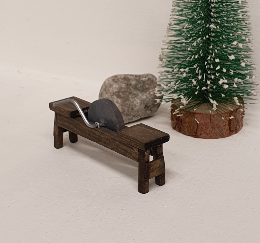 Håndlaget miniatyr slipestein i tre, Lengde 8 cm, høyde 4 cm.