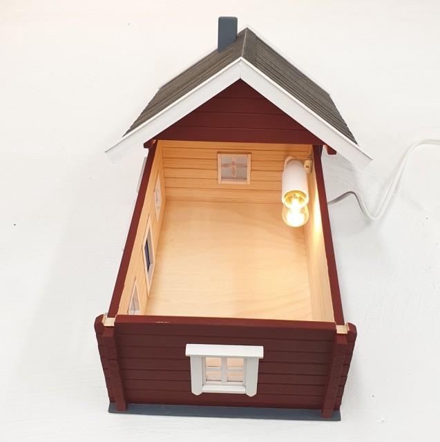 Laftet nissehus med lys - håndlaget av Vassbø Design