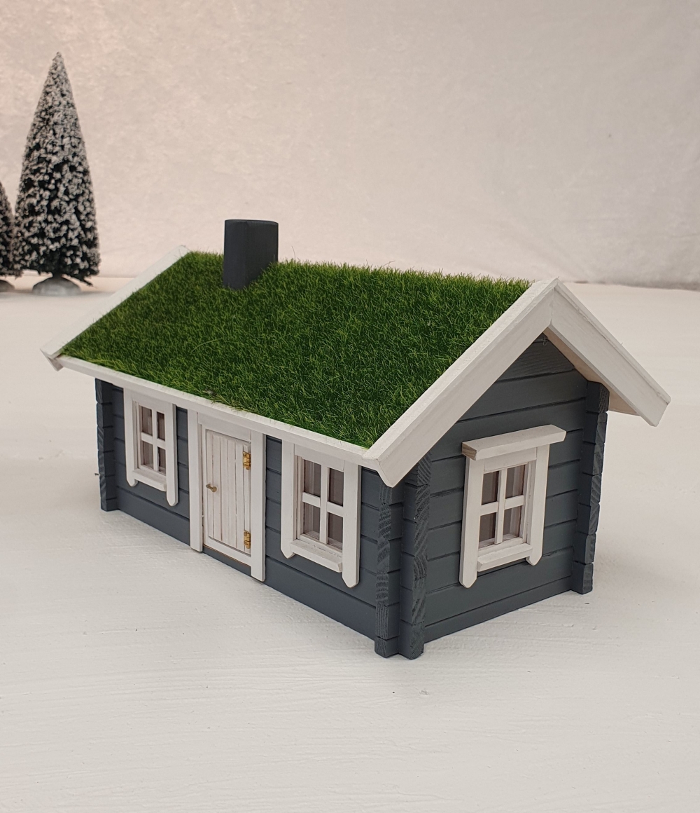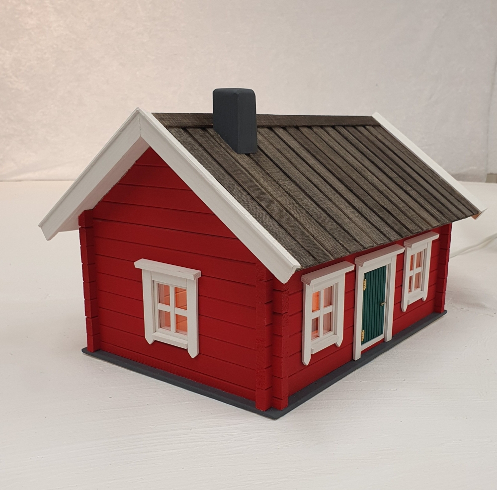 Laftet nissehus med lys og tak som kan tas av. Størrelse 30 x 20 cm, høyde 18,5 cm