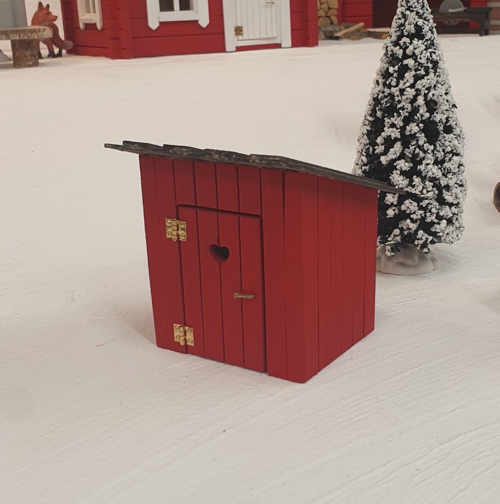 Miniatyr utedo til smånisser - håndlaget av Vassbø Design. 6 x 7.3 cm, høyde foran: 8.5 cm - høyde bak 6 cm