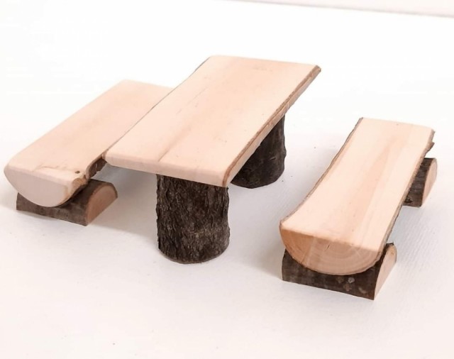Perfekt for julen eller din egen nisseby men og små modell landsbyer. Dette sjarmerende miniatyrmøblet er håndlaget i naturlig tre av Vassbø Design og består av bord - høyde ca 3 cm og lengde ca 6.5 cm, Benker - høyde ca 2 cm og lengde ca 6.5 cm.