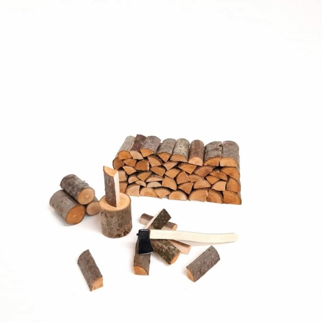 En flott og detaljert miniatyr vedstabel komplett med øks, trestubber og ved. Arbeidet er utført med fokus på kvalitet, naturlig materialer og et realistisk uttrykk.