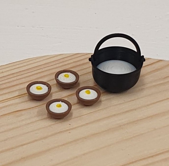 Grøtgryte og 4 grøtskåler - til nissehus, Rampenissen eller annet miniatyr miljø